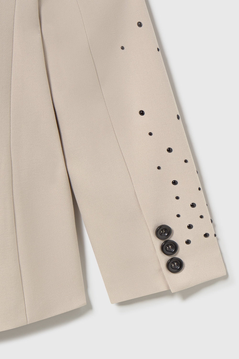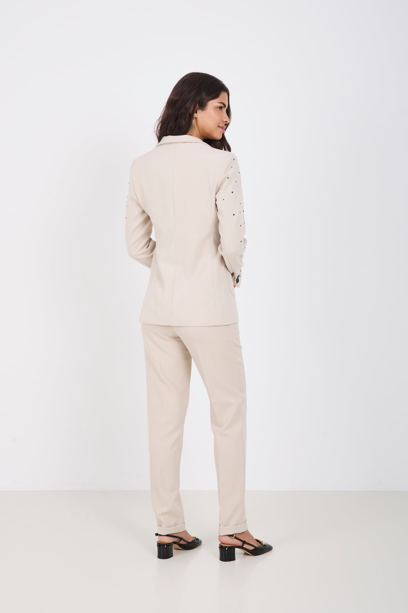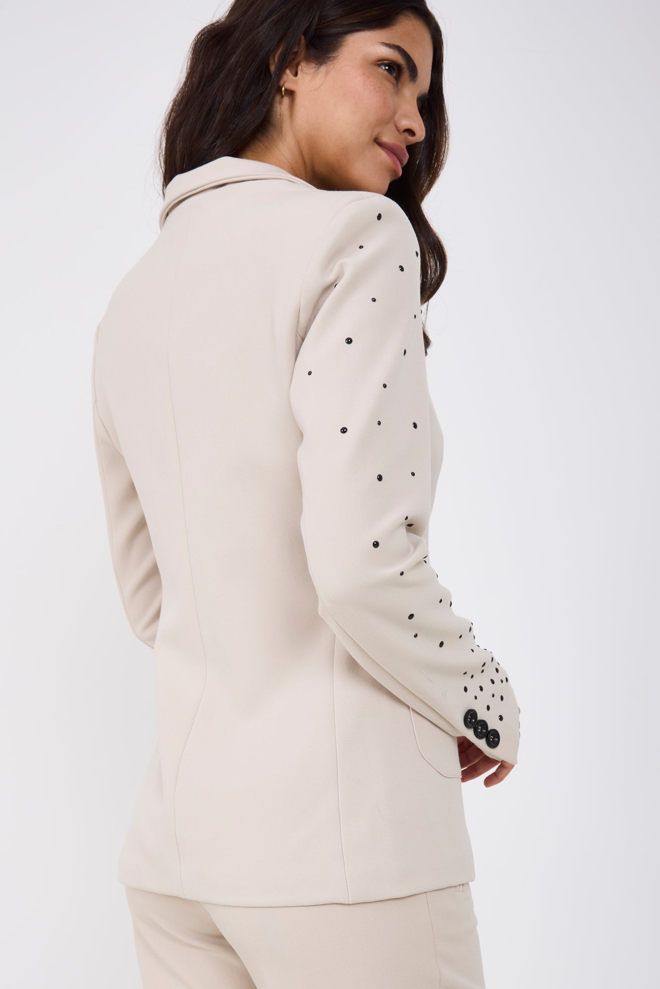Americana beige semi entallada con detalles especializados de tachuelas en tonalidad negro azabache. Combinable con el pantalón Pantalón Traje Beige para crear un conjunto ideal perfecto para un día en la oficina o un evento especial.