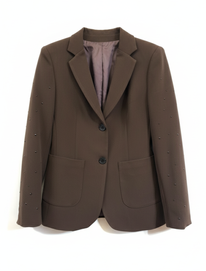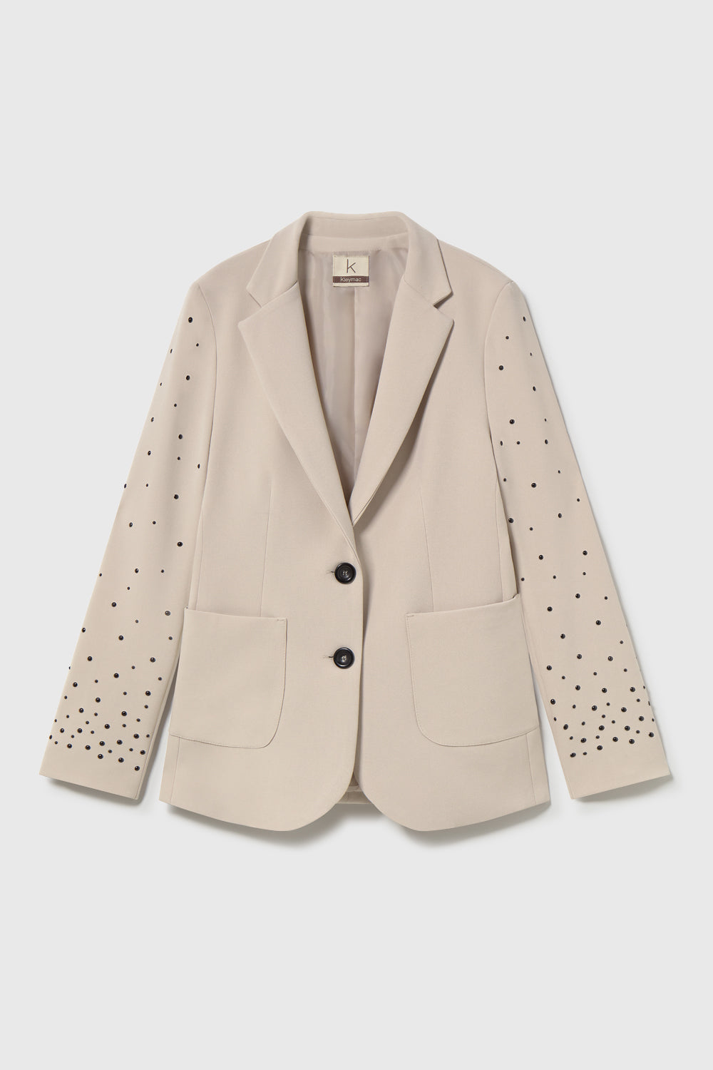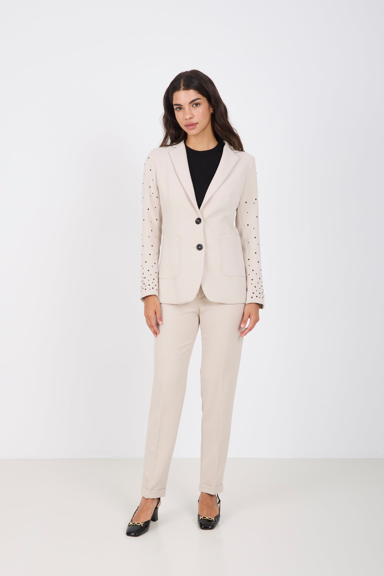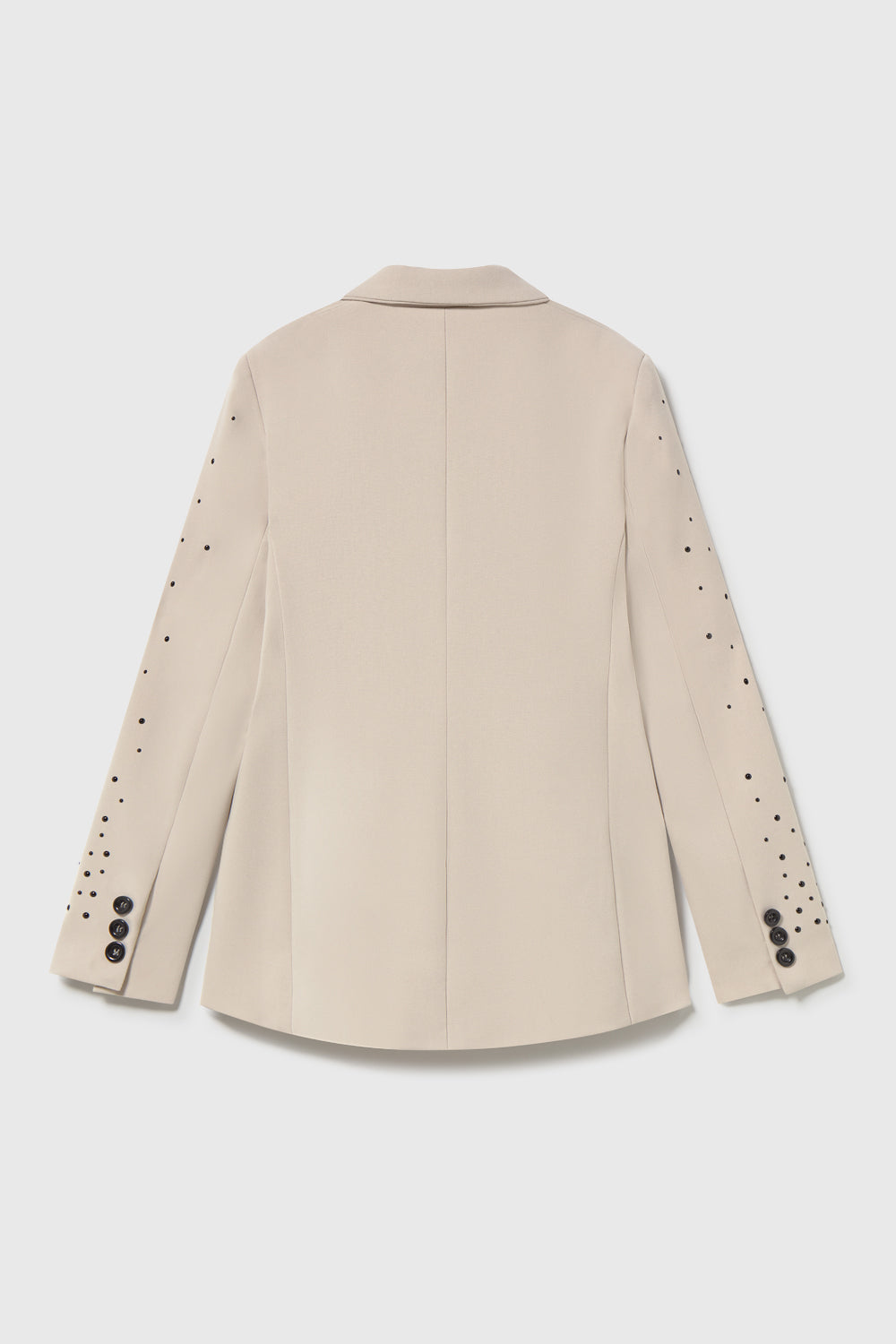 Americana beige semi entallada con detalles especializados de tachuelas en tonalidad negro azabache. Combinable con el pantalón Pantalón Traje Beige para crear un conjunto ideal perfecto para un día en la oficina o un evento especial.
